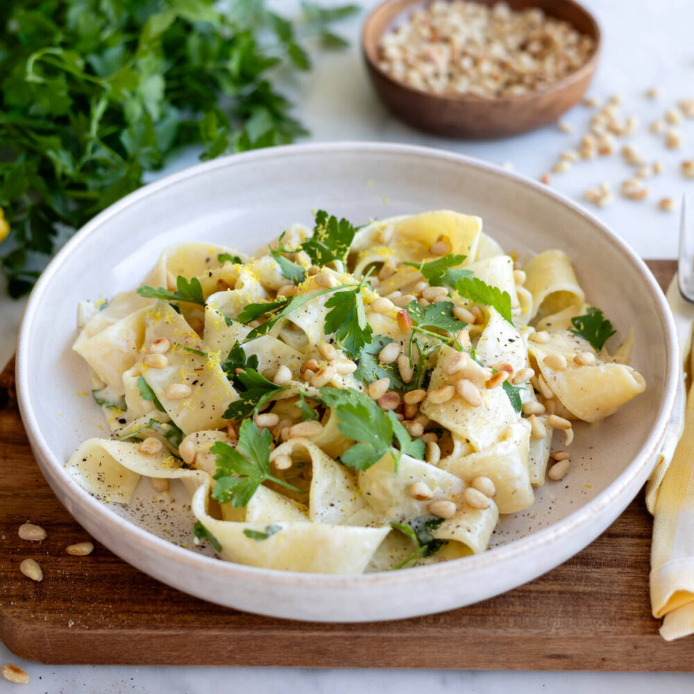 Citronpasta med tre ostar och pinjenötter