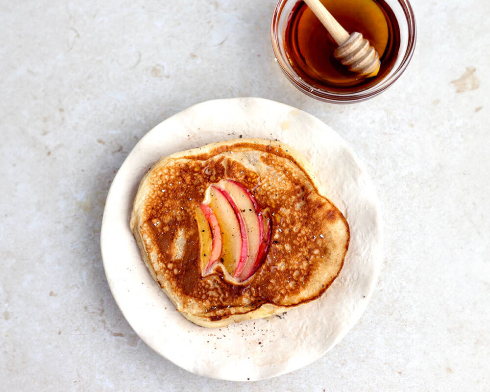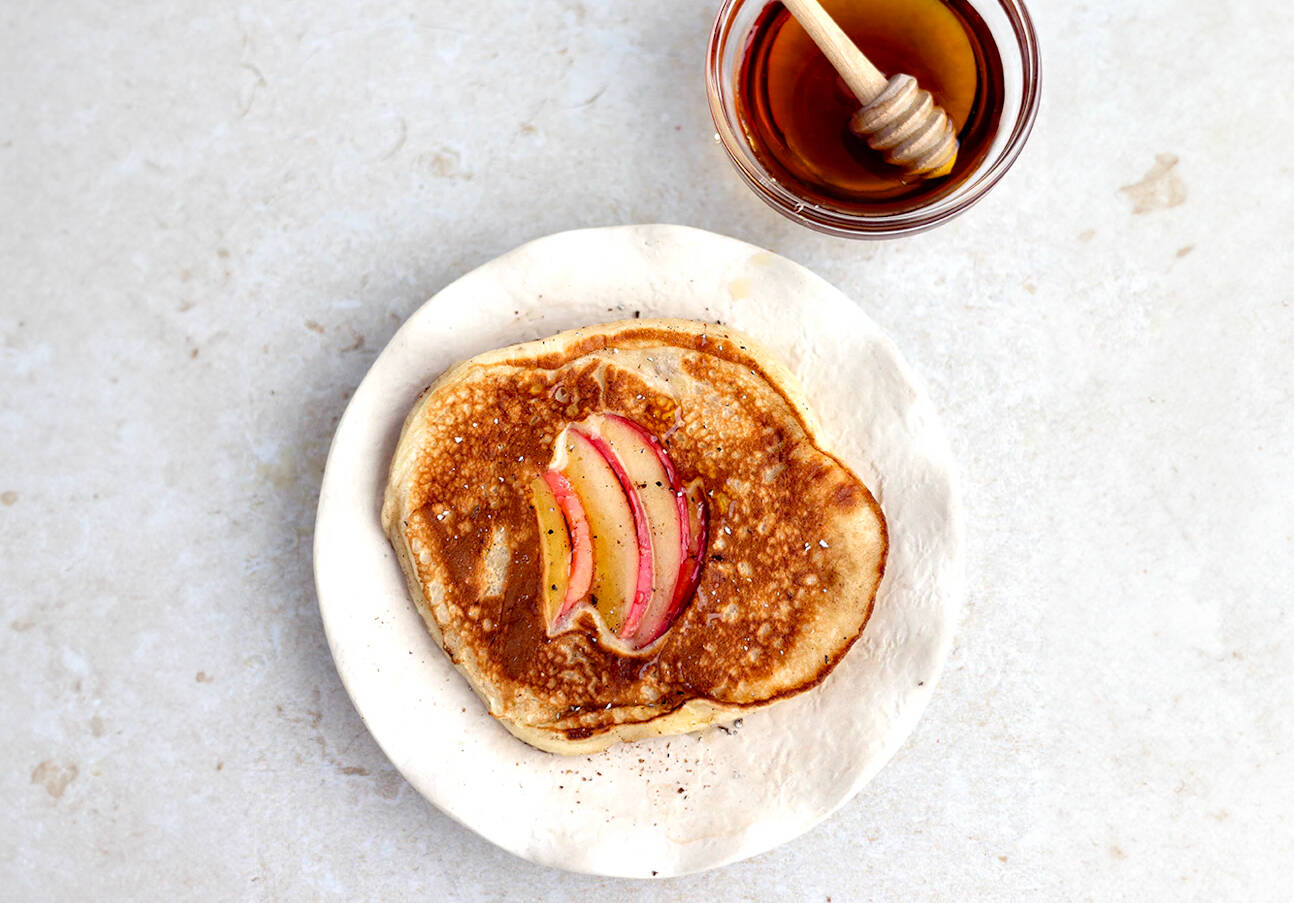 - Hetta upp en stekpanna med en klick smör i. Klicka ut pannkakssmeten, ca 3/4 dl och lägg i några äppelskivor. Stek på medelvärme tills smeten stelnat och du kan vända pannkakan. Upprepa med resten smeten.