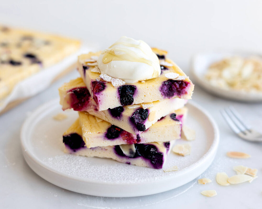 - Strö över rostade mandelflagor och pudra över florsocker. Servera med en klick yoghurt och honung.