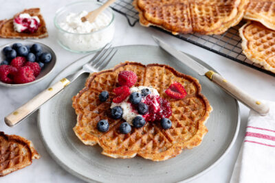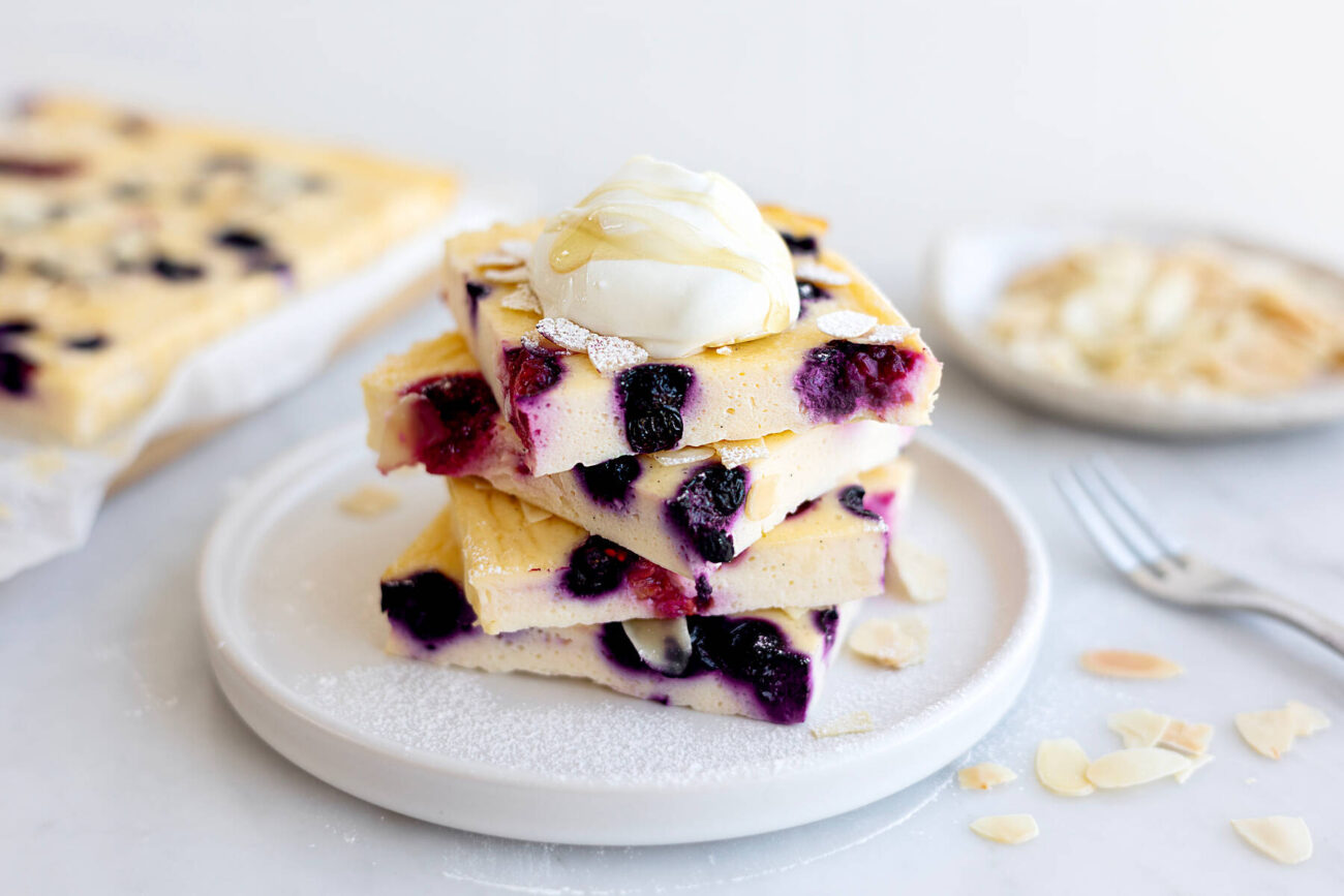 - Strö över rostade mandelflagor och pudra över florsocker. Servera med en klick yoghurt och honung.