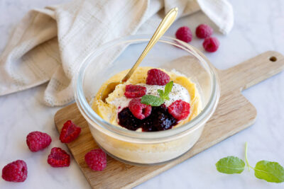 - Toppa med grekisk yoghurt, kokos, hallon och mynta.