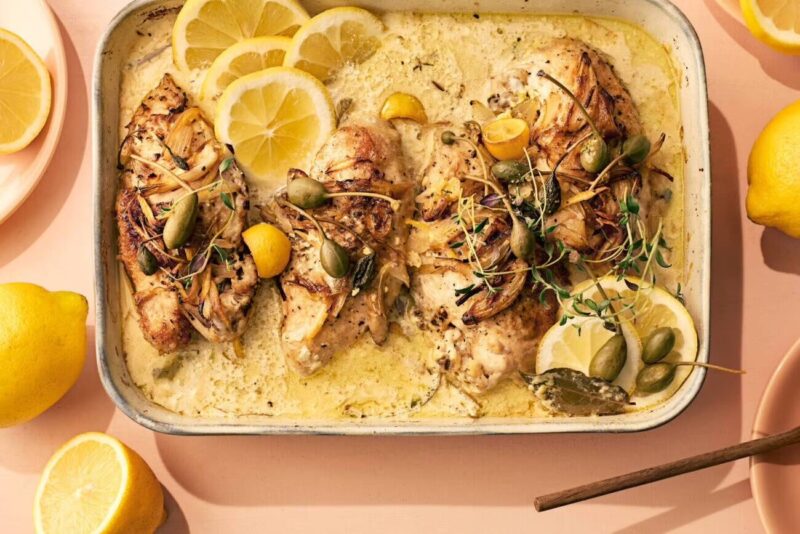 - Smält smör i en stekpanna tillsammans med en skvätt rapsolja tills kycklingen fått fin färg på båda sidor. Lägg kycklingen i en ugnsform.