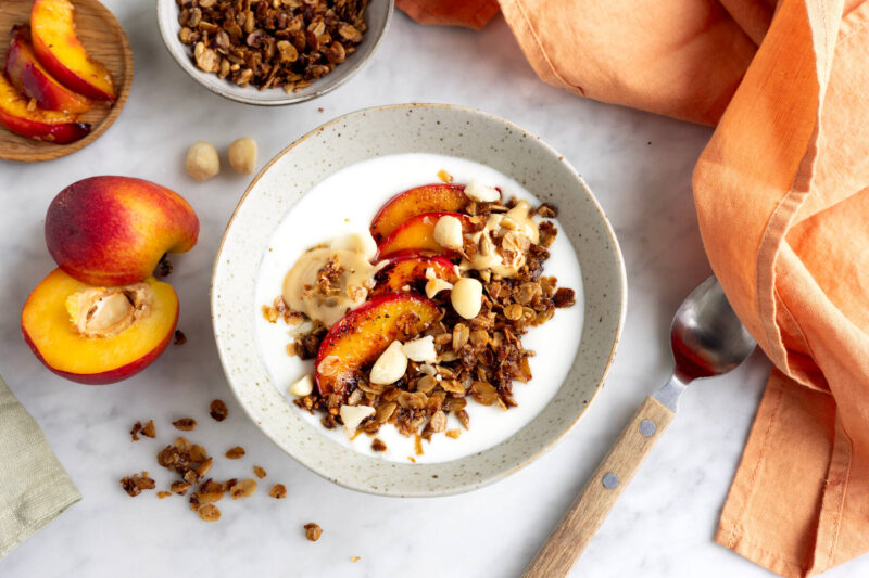 - Häll upp två skålar med yoghurt och toppa med havrecrunch, nektariner, grovt hackade macadamianötter och ringla över honung.