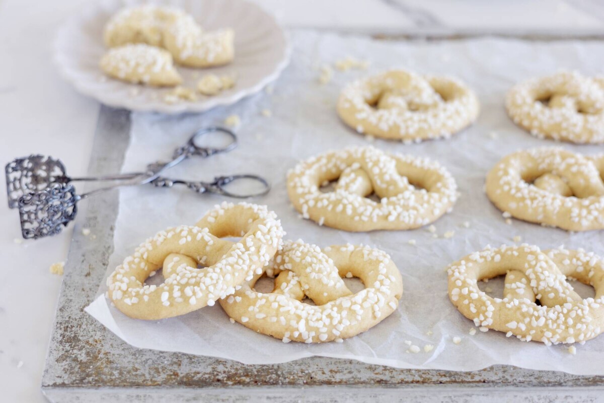 - Fyll en skål med pärlsocker och doppa kringlornas ovansida i sockret. Lägg på en plåt med bakplåtspapper..