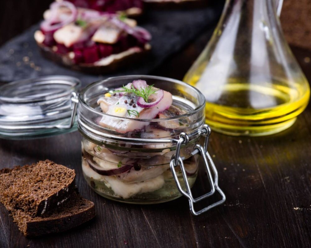 - Varva sill, krossad peppar, nejlikor och rödlök i en burk. Häll över sockerlagen.