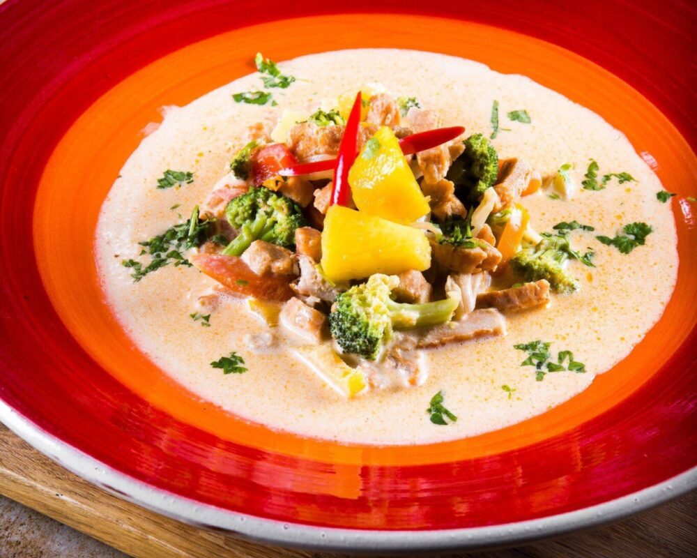 - Tillsätt grädde, kokosgrädde, kycklingfond och kyckling.
