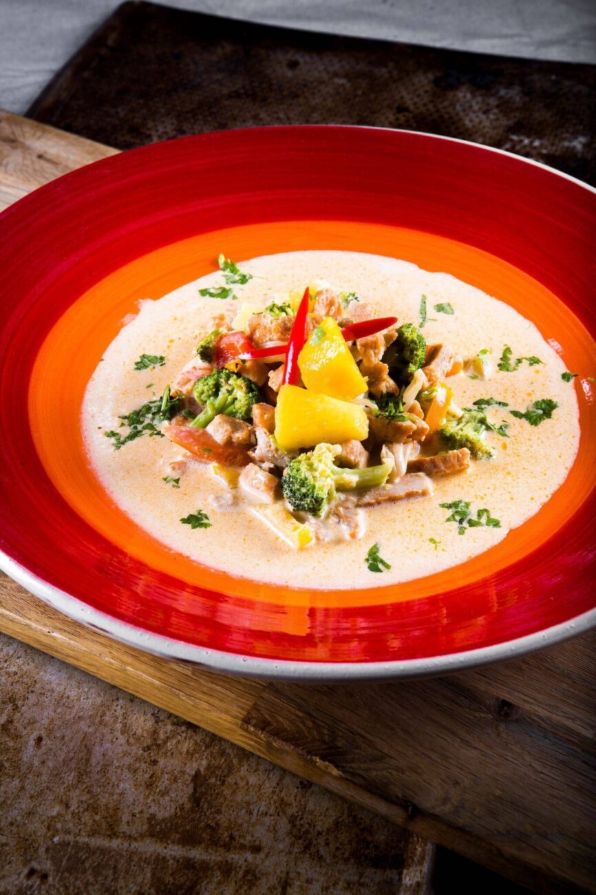 - Tillsätt wokgrönsaker, ananas och limesaft och koka upp. Smaka av med salt, peppar och fisksås.