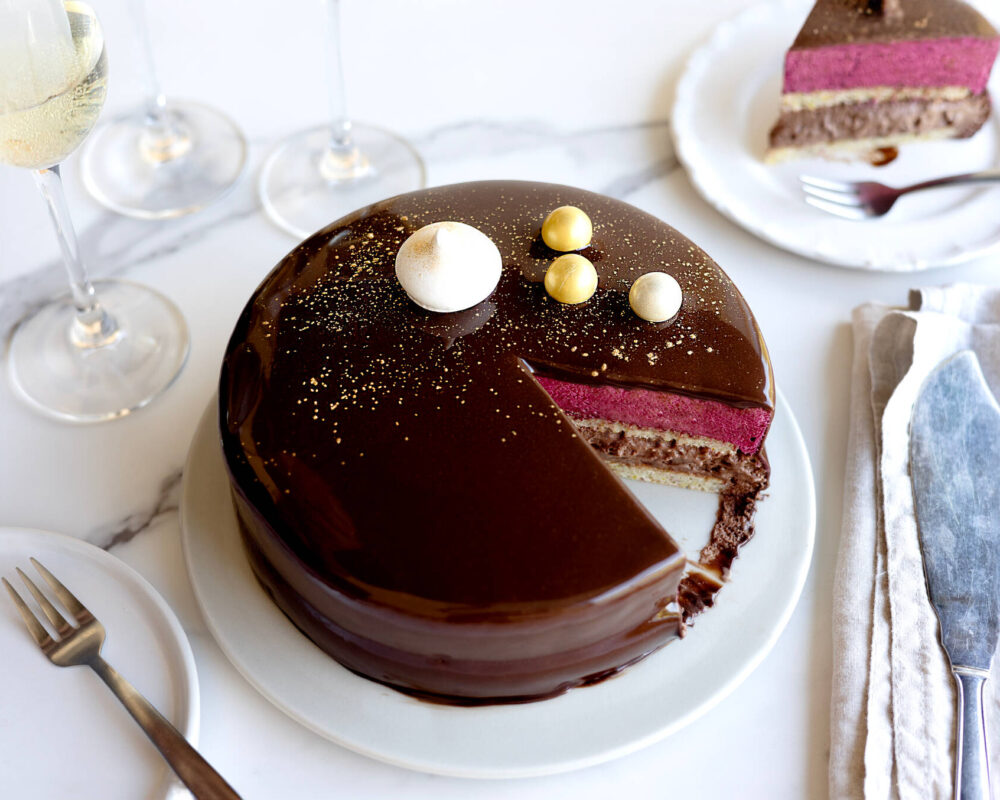 - Låt tårtan stå i kylen minst 4 timmar så glazen stelnar innan du dekorerar. Måla marängerna med guldpulver.