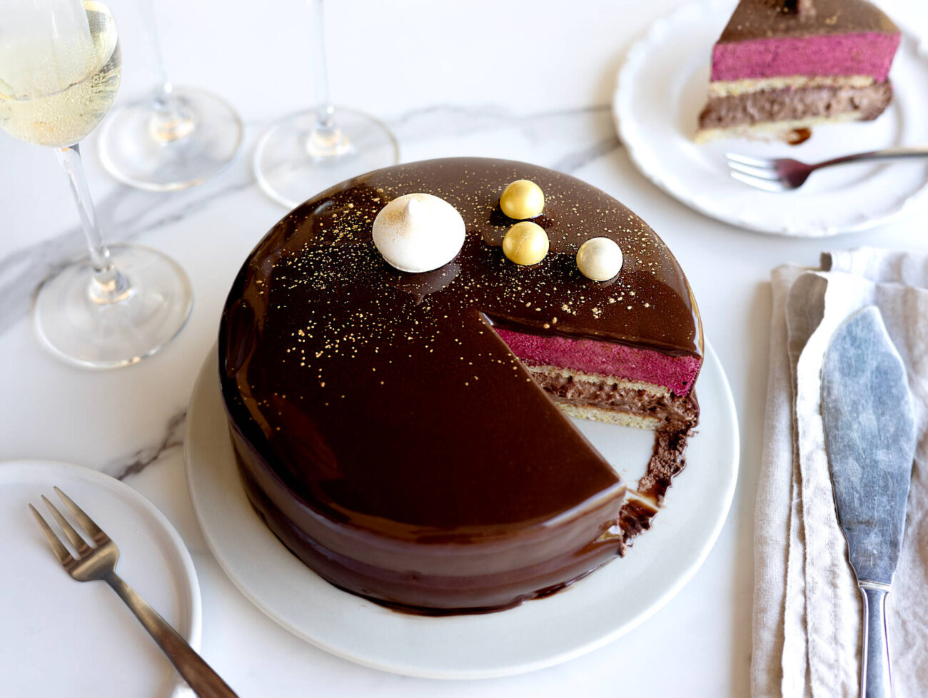 - Låt tårtan stå i kylen minst 4 timmar så glazen stelnar innan du dekorerar. Måla marängerna med guldpulver.