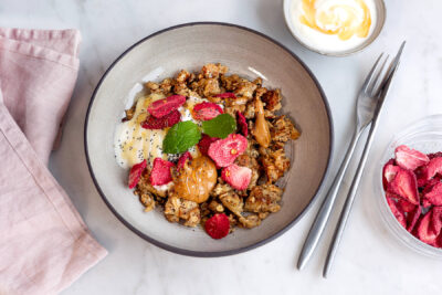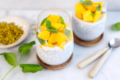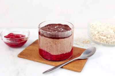 - Blanda samman havregryn, chiafrön, mjölk och kvarg i tre burkar eller glas.