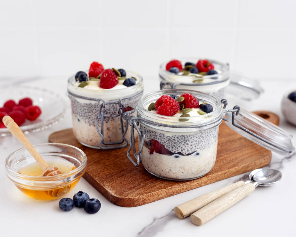 - Ta fram tre portionsburkar och fördela overnight oats i botten på burkarna. Toppa med lite hallon och blåbär. Fördela chiapuddingen över bären.