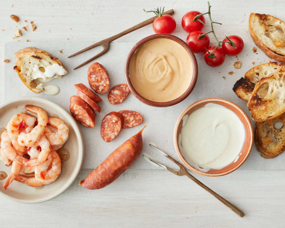 - Häll upp den varma ostcrèmerna i skålar. Servera med brödet, korvarna och räkorna.