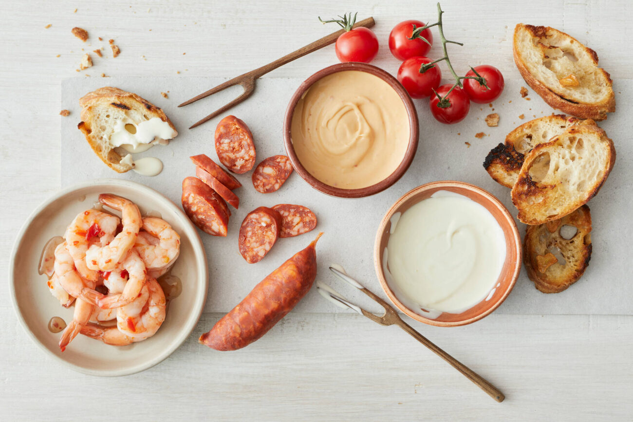 - Häll upp den varma ostcrèmerna i skålar. Servera med brödet, korvarna och räkorna.