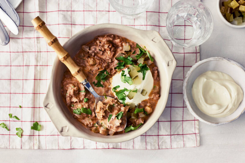 - Garnera med hackad persilja och servera med resten av crème fraichen och ris eller potatismos.
