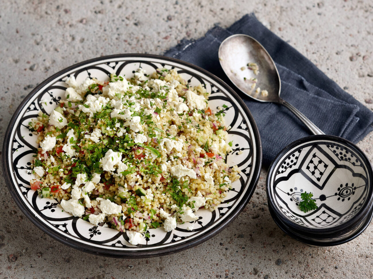- Blanda grönsakerna, lök, myntan och persilja tillsammans med bulguren.