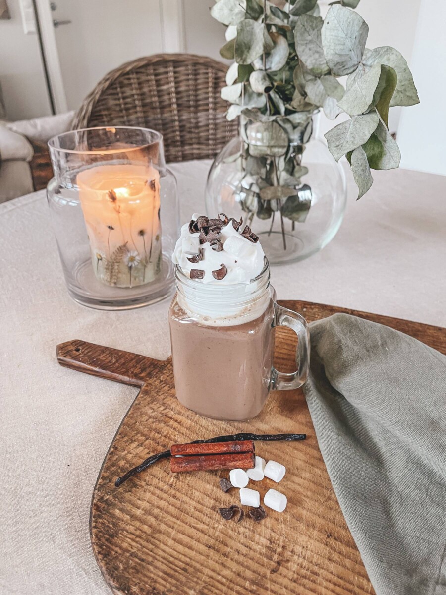 - Mixa med stavmixer så att den varma chokladen blir lite skummig. Servera med vispad grädde, mini-marshmallows och riven choklad.