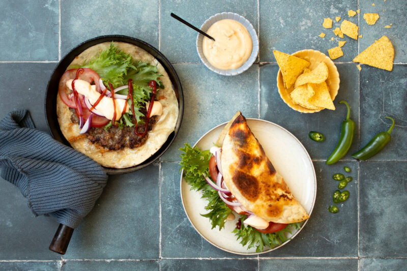 - Fyll de färdiga tortillorna med sallad, tomat och rödlök. Ringla över dipp-såsen och ketchup för sås. Vik ihop.